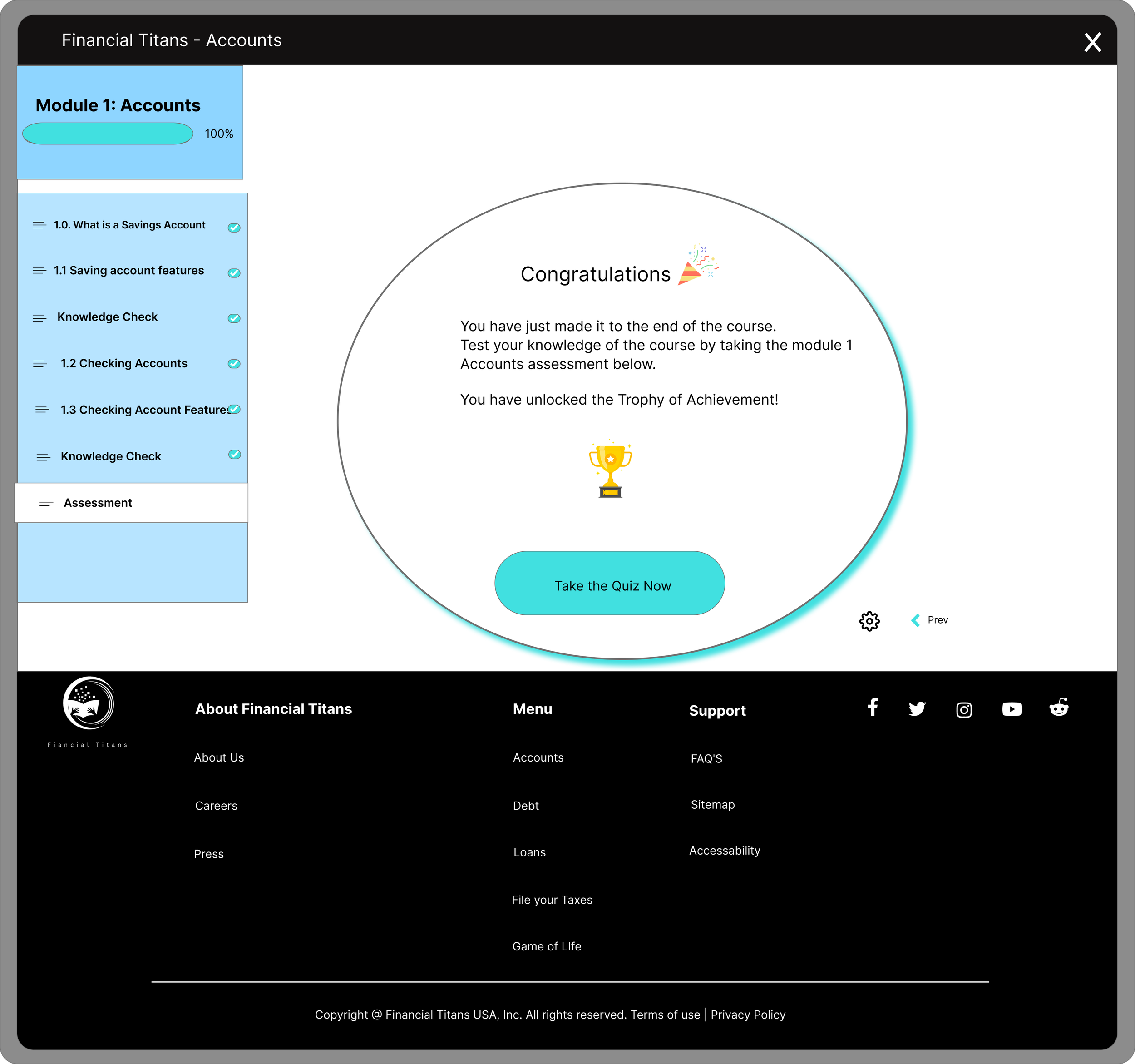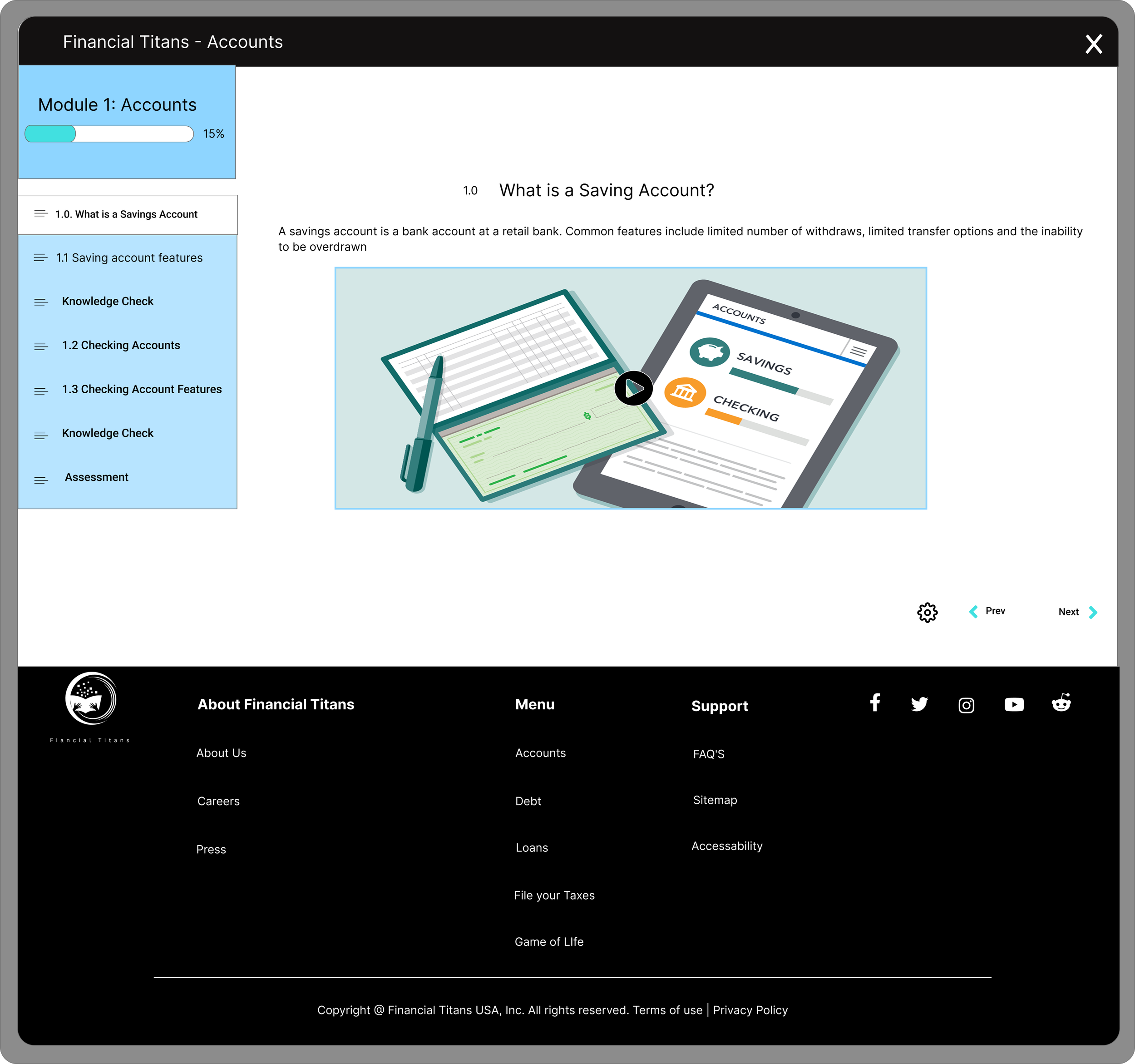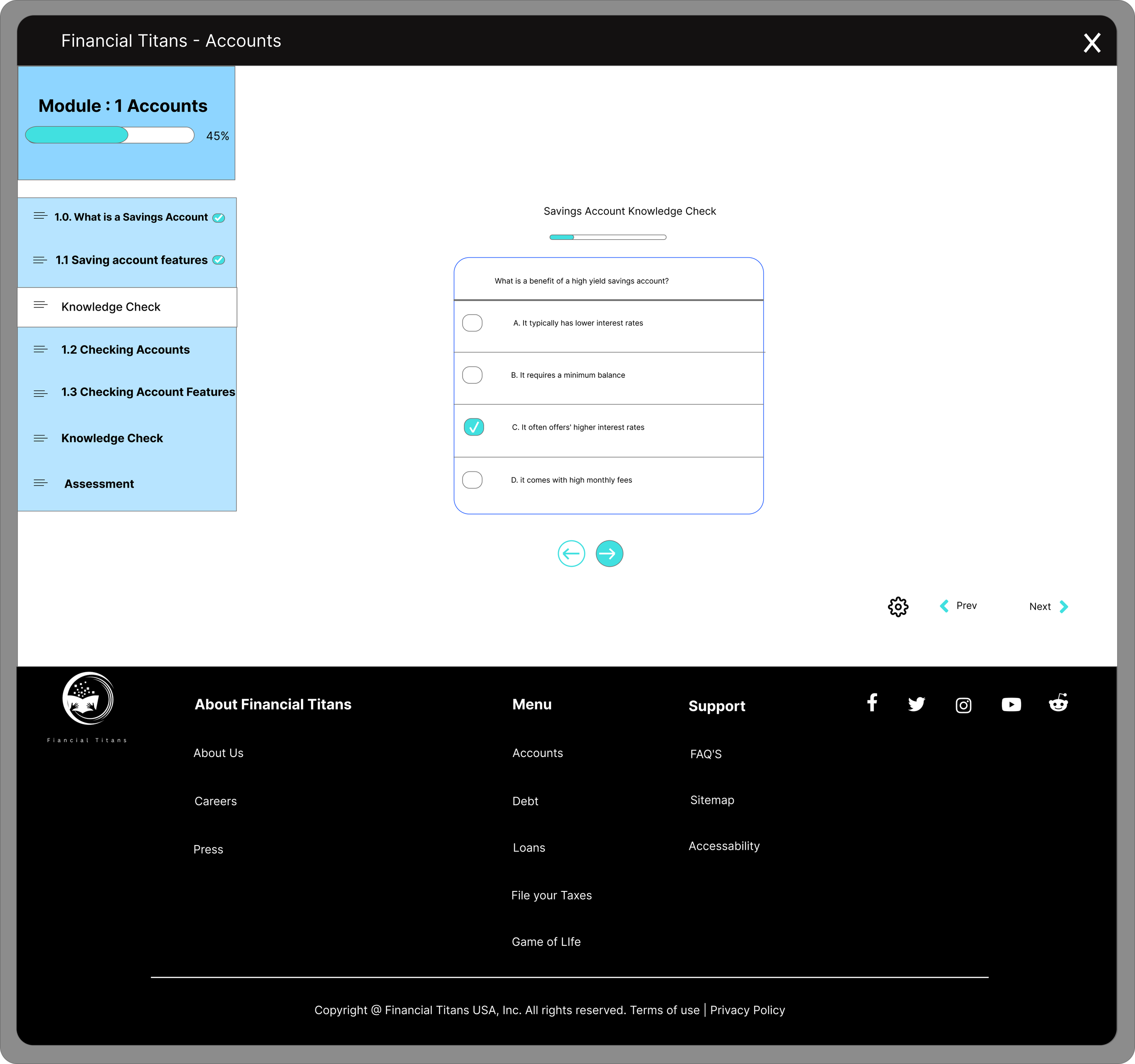 The website provides young adults with the ability to take multiple modules and learn key financial terms through knowledge checks and quizzes.