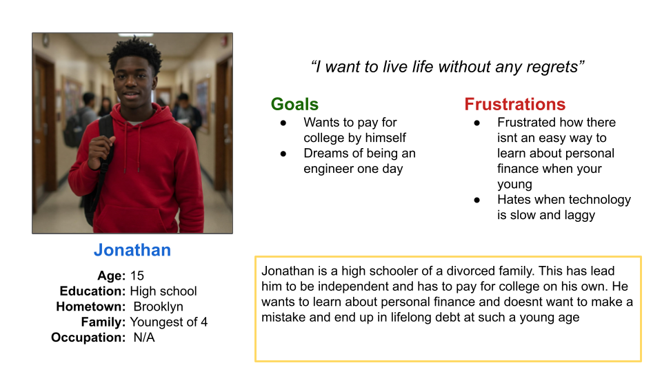 A main problem we faced was how will our high schools retain the text-based information, especially if they are not immediately joining the workforce right after high school? We created an interactive game to test users financial literacy concepts.